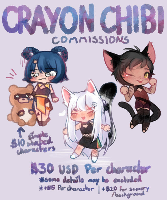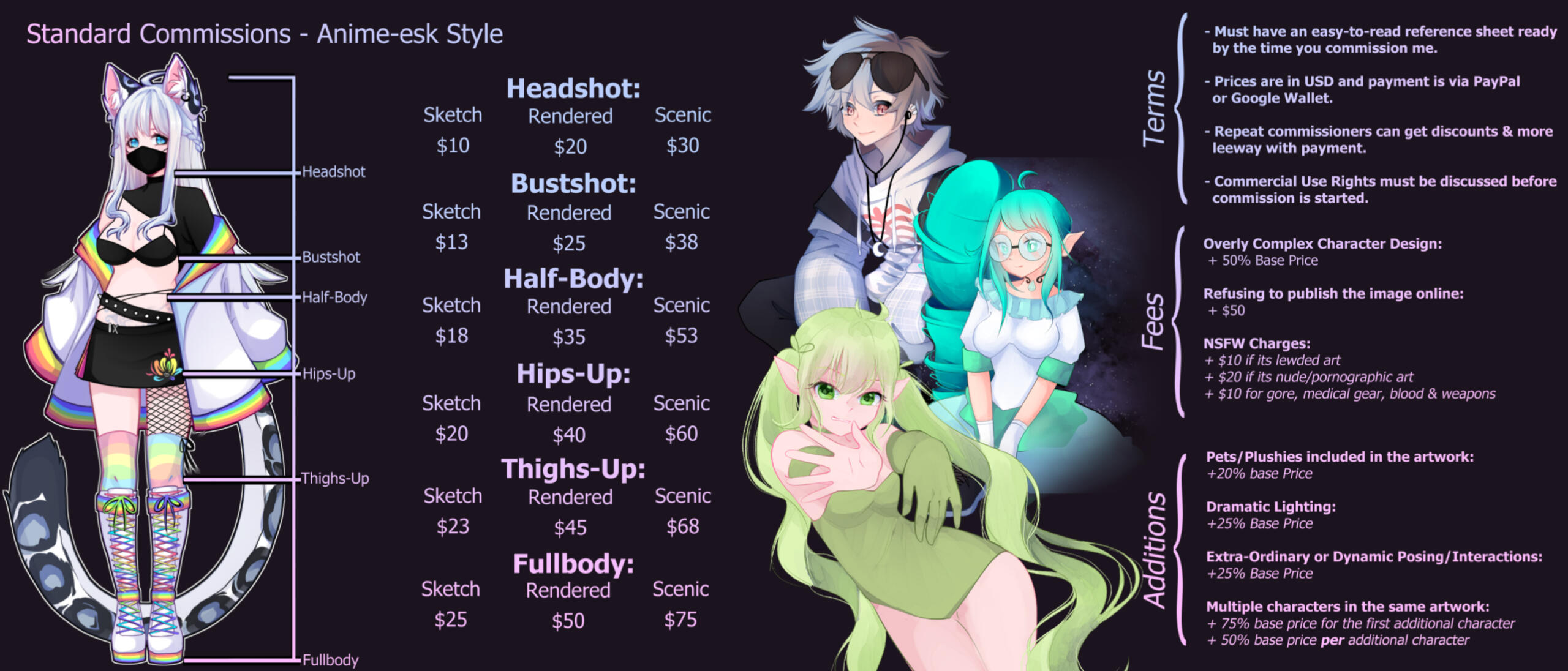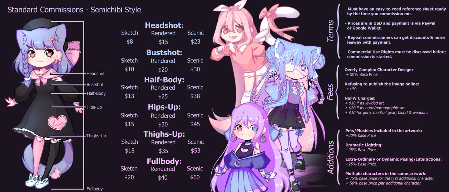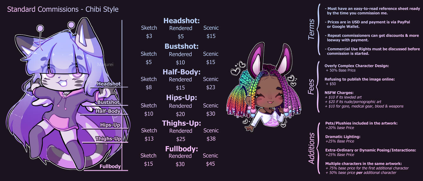 I offer commissions in different styles / formats! The buttons below will break down my prices in an easy-to-read commission sheet.