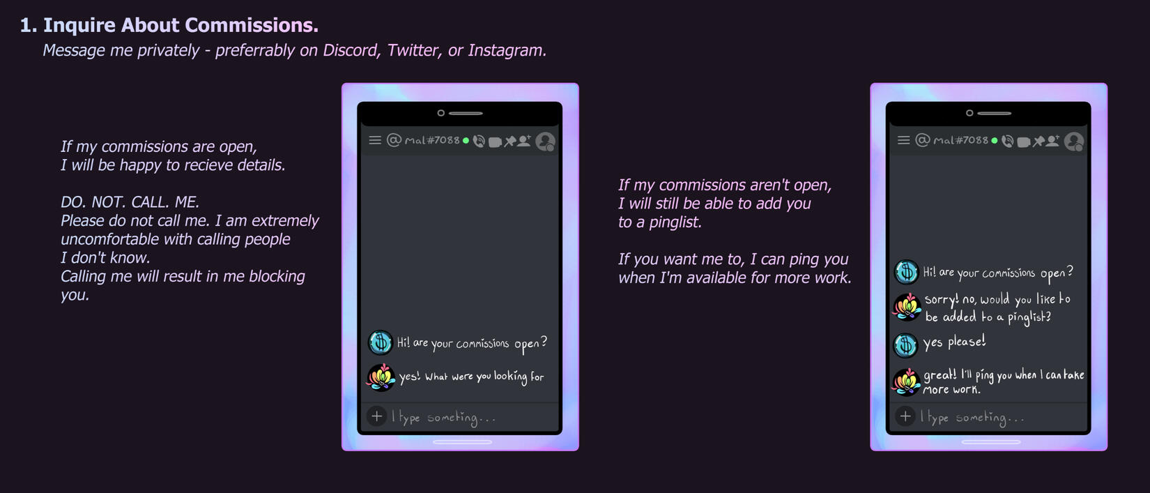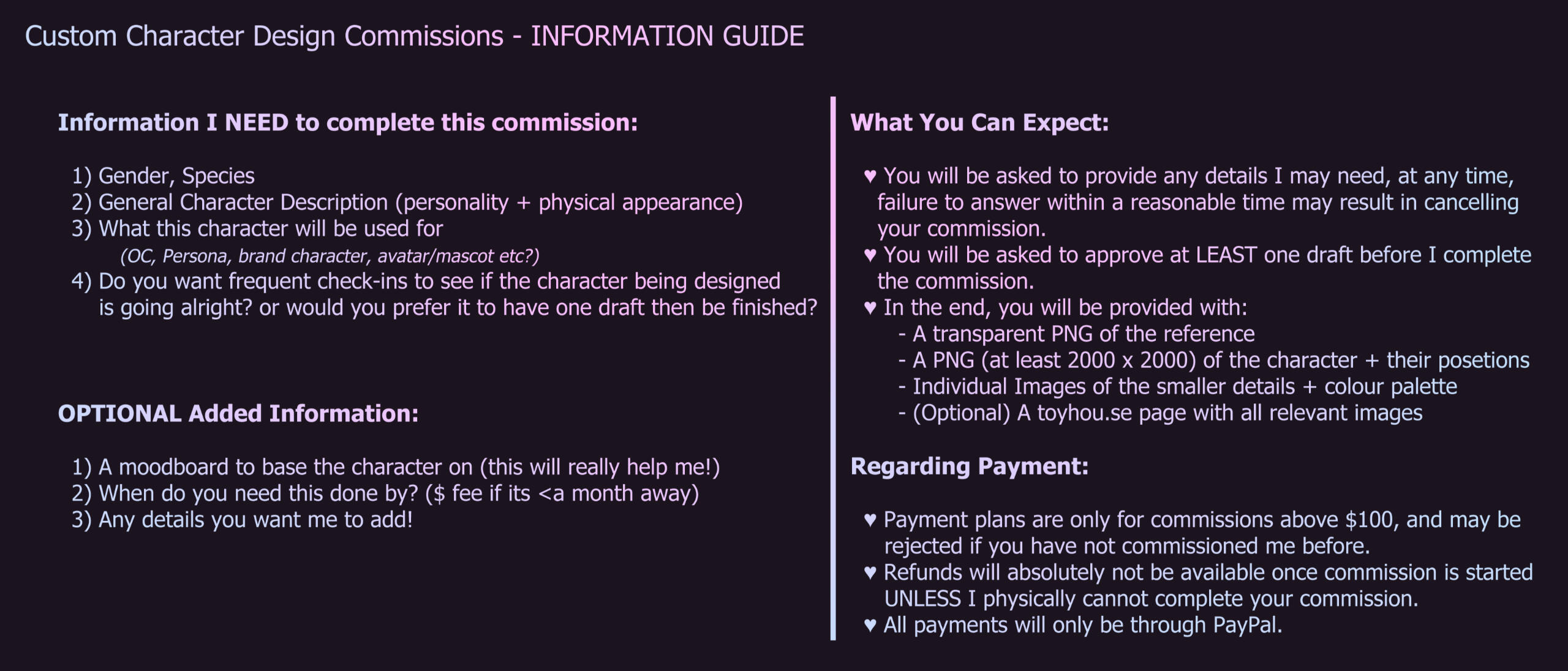 This page will be a general guide on how to commission me!Please understand that the best way to commission me may not work for other artists, but this will greatly help be a guide if you are new to commissioning custom work!
